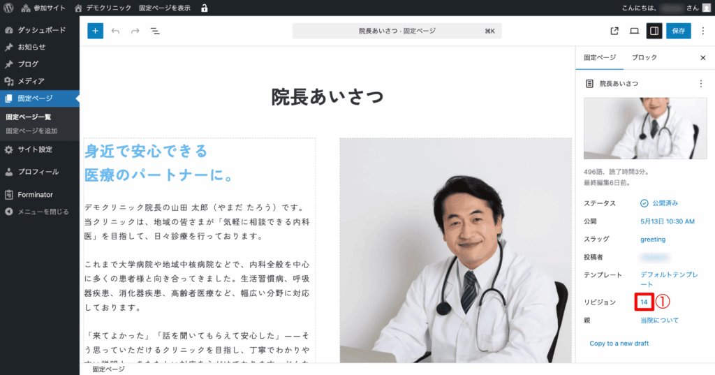 該当ページの編集画面を開き、画面右側の固定ページタブから「リビジョン」の数字(下図①)をクリックします。