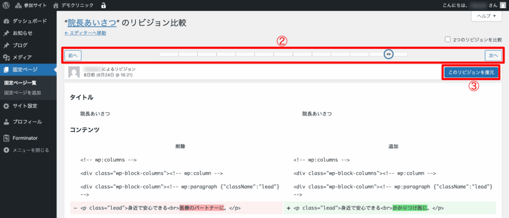 「リビジョン比較」画面で「前へ」「次へ」「スライダー」(下図②)で復元したいリビジョンを表示し、「このリビジョンを復元」(下図③)をクリックして記事を復元します。