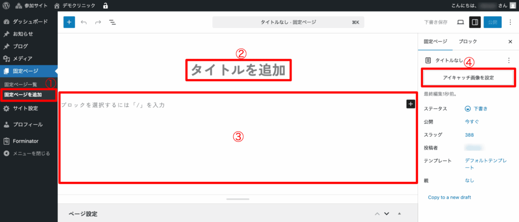 - 編集画面でタイトル(下図②)、本文(下図③)、アイキャッチ画像(下図④)を編集します。