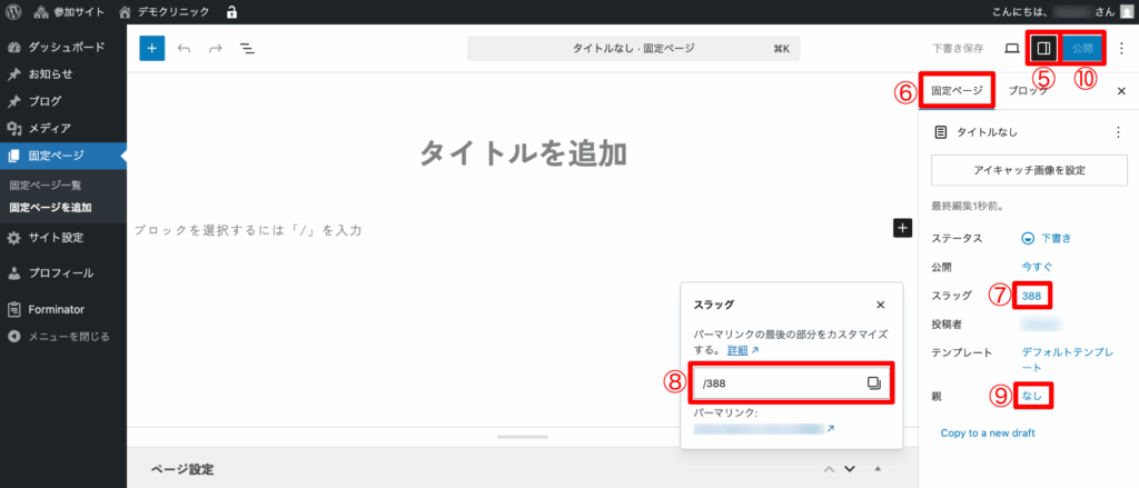 - ページを新規作成した場合、パーマリンク(上図⑧)にはデフォルトで「ページID」が設定されます。このままでも運用可能ですが、固定ページの場合は分かりやすいスラッグ(半角英数)に変更してください。