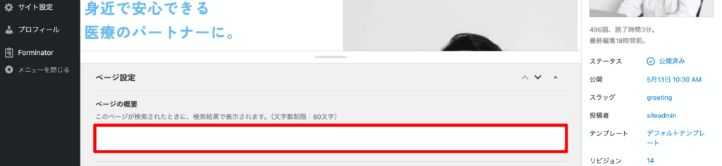 - 「固定ページ」から編集するページの編集画面を開きます。