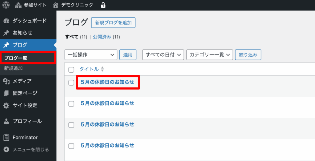 ブログの編集方法 画面左側にある「ブログ一覧」(下図①)をクリックすると記事の一覧(下図)が表示されます。 編集したい記事の「タイトル」(上図②)をクリックします。 編集画面で変更する箇所を修正し、「保存」ボタンをクリックします。 目次に戻る