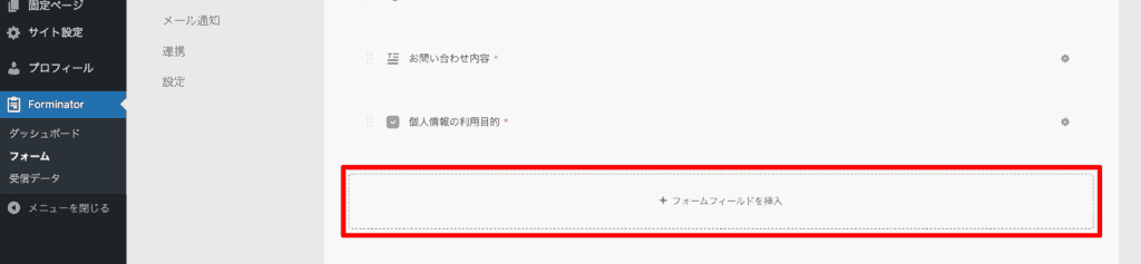 フォームの編集画面で項目一覧の下にある「フォームフィールドを挿入」をクリックし、内容を編集します。