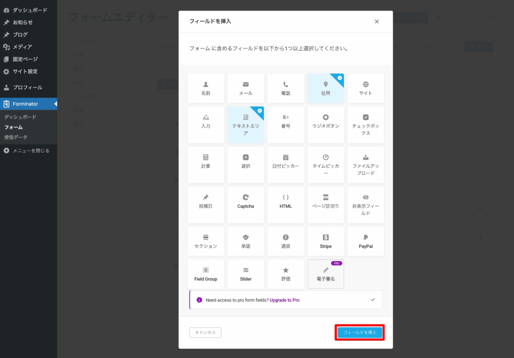 表示される一覧からフィールドを選択し、「フィールドを挿入」をクリックします。