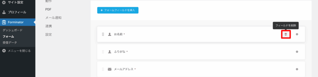 項目一覧で、削除したい項目の「フィールドを削除」をクリックします。