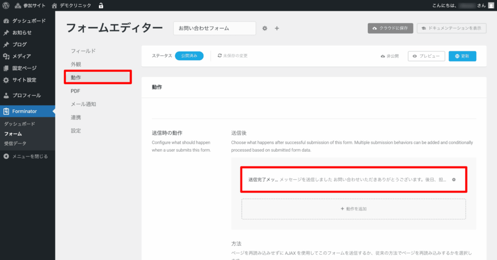 フォームの編集画面左側のメニューから「動作」をクリックし、「送信完了メッセージ」をクリックします。