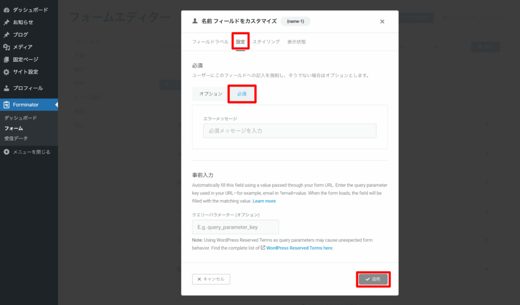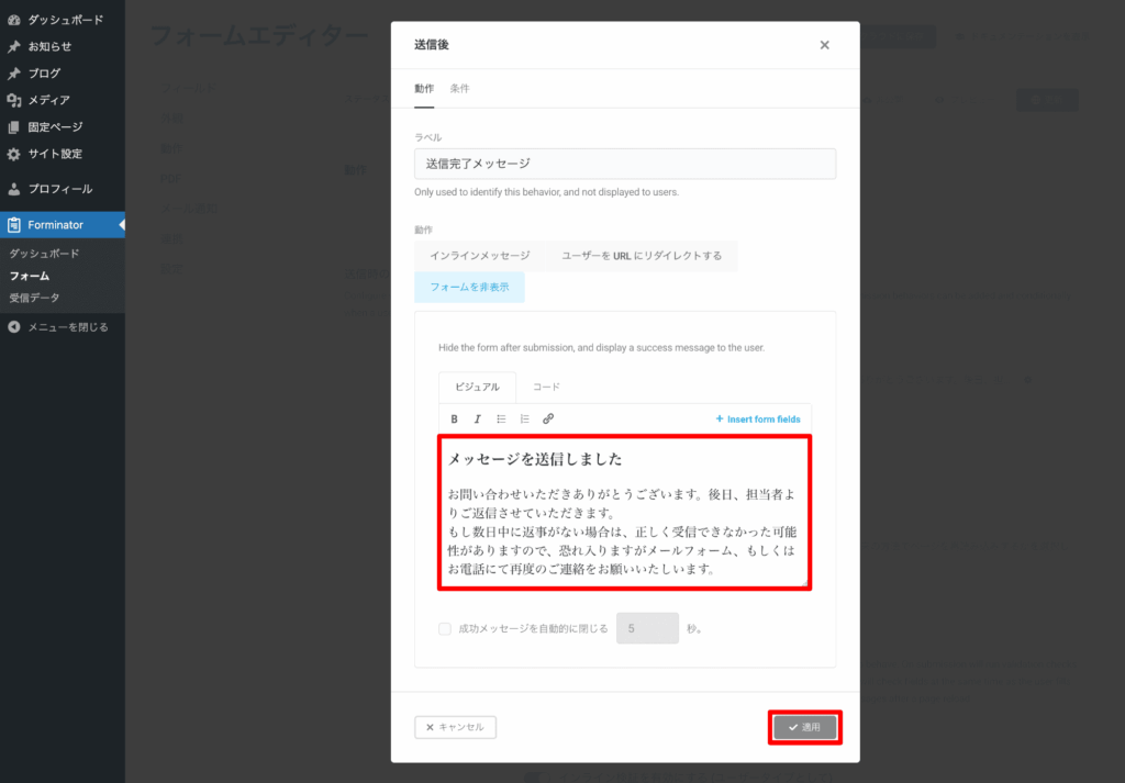 必要に応じて送信完了メッセージを編集し、「適用」をクリックします。