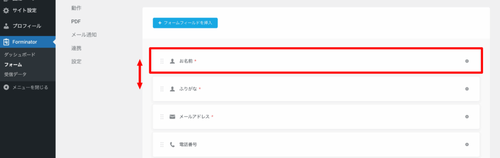 項目一覧で、移動したい項目をドラッグして順番を入れ替えます。