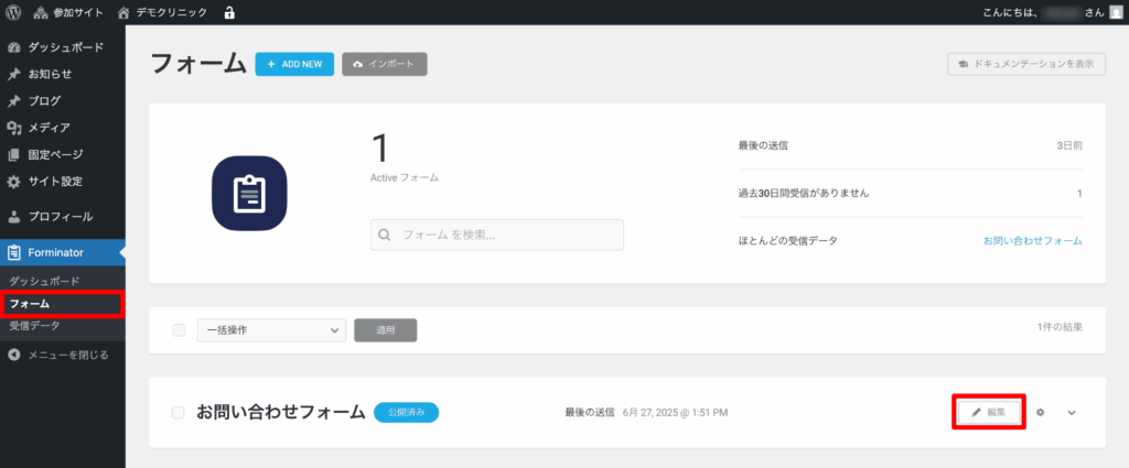 管理画面メニューの「Forminator」>「フォーム」をクリックし、編集するフォームフォームの「編集」をクリックします。