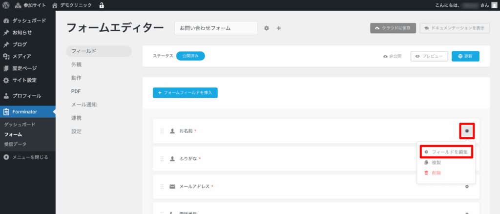 フォームの編集画面で編集したい項目の歯車マークをクリックし、「フィールドを編集」をクリックします。