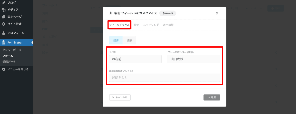 必要に応じて「フィールドラベル」タブで「ラベル」「プレースホルダー」「詳細説明」を編集します。