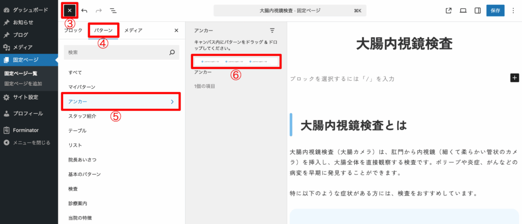 - 「+」(下図③)をクリックし、「パターン」タブ(下図④)の「アンカー」(下図⑤)にある「アンカー」(下図⑥)をクリックし挿入します。