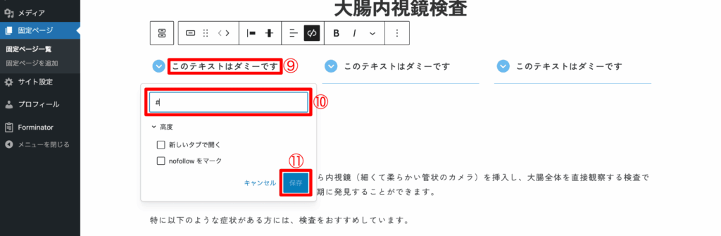- テキスト(下図⑨)を入力、URL(下図⑩)の「#」の後に1)で設定したHTMLアンカーを入力し、「保存」(下図⑪)をクリックします。