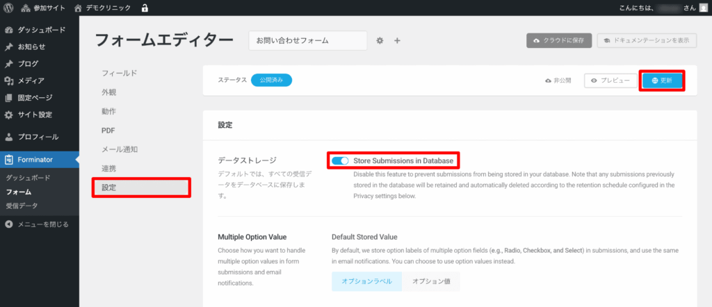 フォーム編集画面の「設定」をクリックし、「データストレージ」を有効化して更新します。