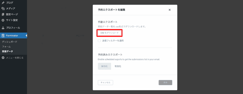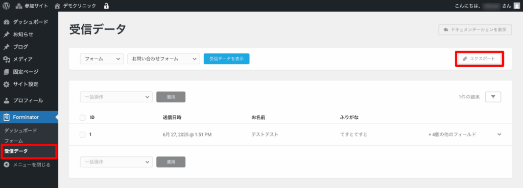 画面左側のメニュー「Forminator」>「受信データ」をクリックし、「エクスポート」をクリックします。