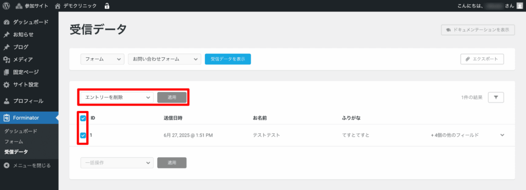 受信データ一覧で削除したいデータにチェックを入れ、「エントリーを削除」を選択して「適用」をクリックします。