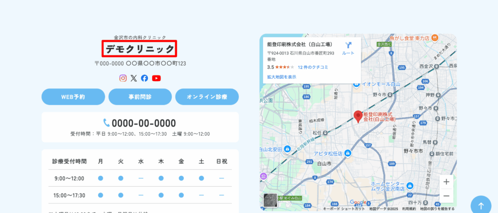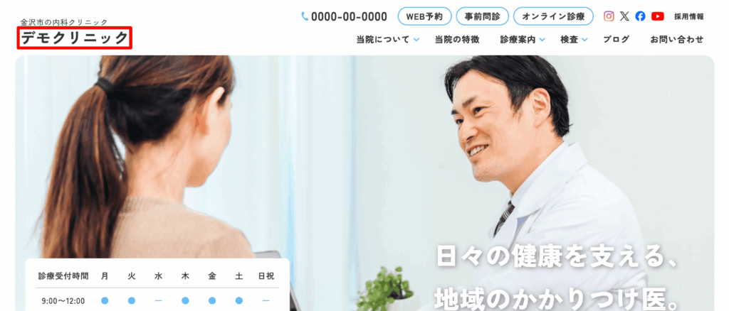 設定したクリニック名は、サイトのヘッダーやフッターに表示されます。