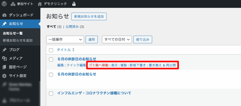 「ゴミ箱へ移動」「表示(プレビュー)」「複製」「新規下書き」「書き換え&再公開」
