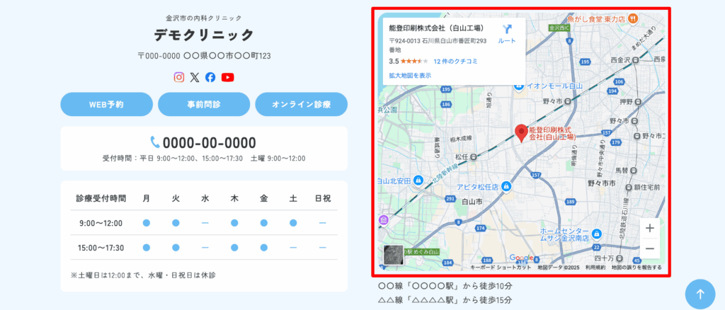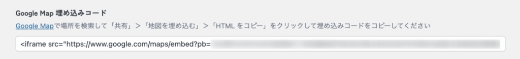 管理画面メニューの「サイト設定」>「Google Map 埋め込みコード」から設定できます。