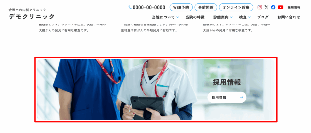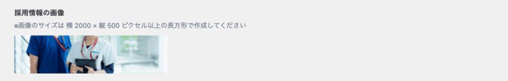 設定した画像は、サイトのトップページの「採用情報」に表示されます。 「採用情報」の設定方法 管理画面メニューの「サイト設定」>「採用情報」から設定できます。「画像」を設定してください。 画像サイズは横2000×縦500ピクセル以上、ファイル形式はpngまたはjpgでご作成ください。 目次に戻る
